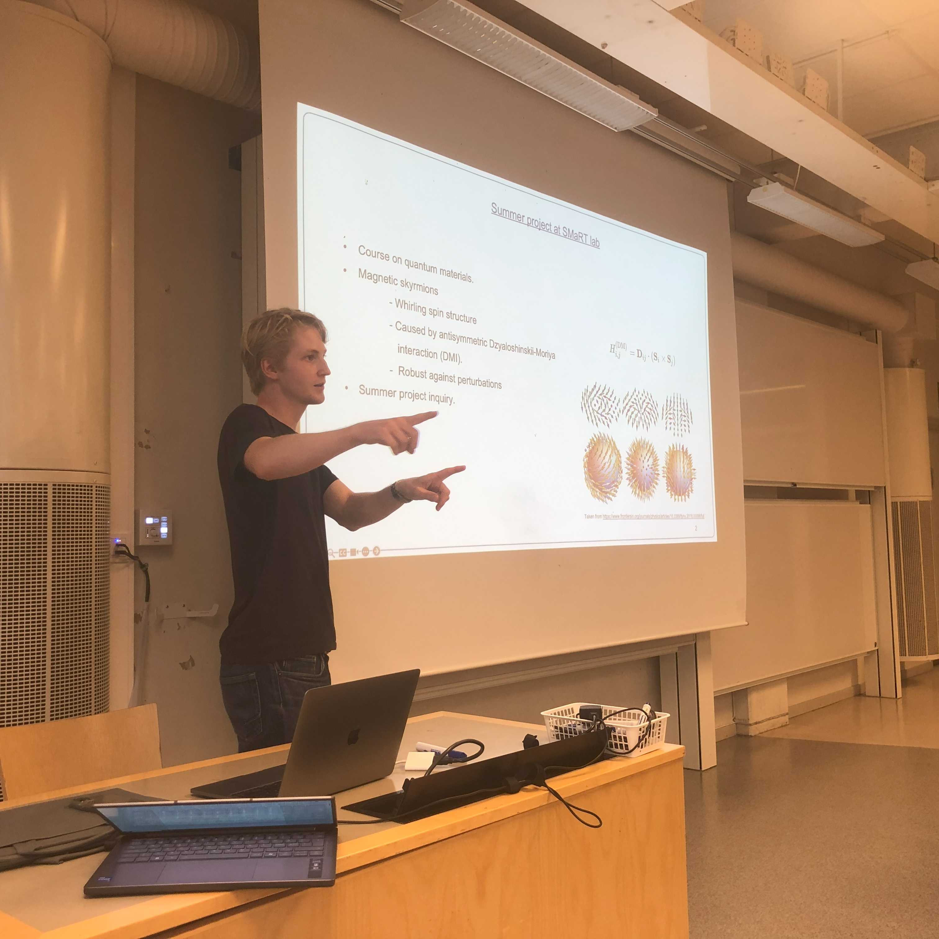 Our board members, Tor and Wilhelm, presented their research projects. Tor explained his summer project in Quantum Materials, and Wilhelm his bachelor's thesis in Quantum Optics. The presentations were followed by questions and discussions, and then board games and fika.